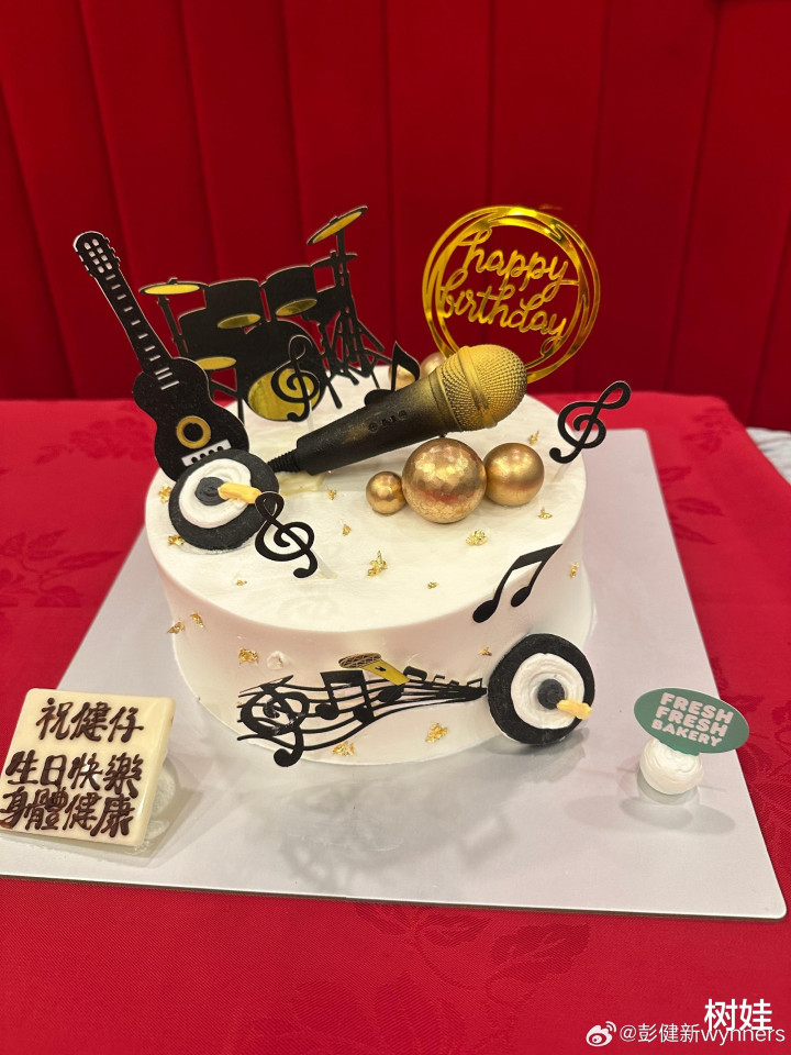 众人在主席台前合照,主席台特别布置了一番,以红色的背景为主,正中有一个巨大的“寿”字,两边还有祝寿的对联。现场准备了一个音乐风格的蛋糕,上面有麦克风还有乐谱,另外还有一大盘的寿包。合照中彭健新与妻子站在中间,老友们分别站在两边,众人伸展双手,对着镜头笑脸相迎。坦白说看不出彭健新的实际年龄,76岁的他俨然要比实际年龄更年轻,说他65岁都不夸张,事实上,对比起在旁边66岁的苗侨伟,两人还真是不相上下,就像是同龄人一般。